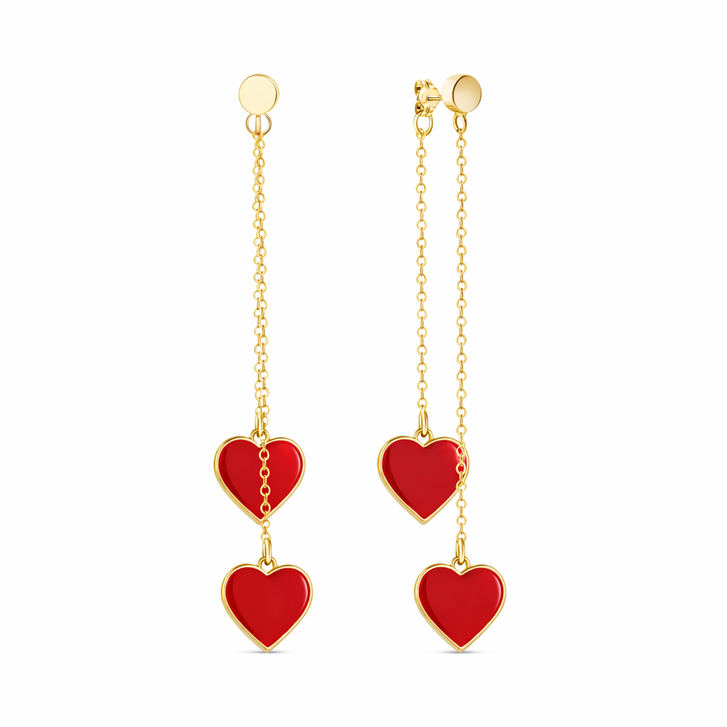 Elevate your look with the Single Hearted Girl Red Dangle Earrings. These elegant earrings feature double sided red enamel heart charms, on gold filled double chain, creating a striking and meaningful accessory that stands out.